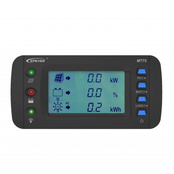 EPEVER MT75 to najnowszy panel sterujący zaprojektowany z myślą o tych, którzy potrzebują monitorowania zarówno kontrolerów ładowania słonecznego, jak i falowników w systemach off-grid. Urządzenie to oferuje pełną kontrolę i dostęp do najważniejszych danych operacyjnych, dostarczając użytkownikowi w czasie rzeczywistym informacje o statusie pracy oraz alarmy o potencjalnych usterkach. Dzięki nowoczesnemu, 4.7-calowemu ekranowi LCD, użytkownik może z łatwością odczytać wszystkie kluczowe informacje w przejrzysty sposób. Wyjątkową cechą MT75 jest możliwość automatycznego identyfikowania podłączonych urządzeń, co znacznie ułatwia jego konfigurację i codzienne użytkowanie. Panel MT75 jest kompatybilny z szeroką gamą kontrolerów i falowników marki EPEVER, co sprawia, że jest wszechstronnym rozwiązaniem dla różnych systemów off-grid.
