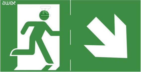 Piktogram KIERUNEK DO WYJŚCIA EWAKUACYJNEGO W DÓŁ W PRAWO, 150x300mm o numerze katalogowym PD23 w kategorii Piktogramy, Oprawy awaryjne. Produkt wyprodukowany przez markę AWEX.