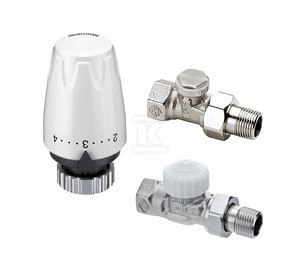 Głowica termostatyczna DX M30x1.5 z dolnym ogranicznikiem, wartości nastaw 2-5, zakres nastaw temp. 16 °C do 28 °C oraz zawór termostatyczny V-exakt II DN15 niklowany, kapa biała, prosty, z nastawą wstępną oraz grzejnikowy zawór odcinający, Regutec DN15(1/2), prosty, niklowany o numerze katalogowym DMK863 w kategorii Głowice termostatyczne i zawory>Głowice termostatyczne tradycyjne. Produkt wyprodukowany przez markę IMI HEIMEIER, seria DX.