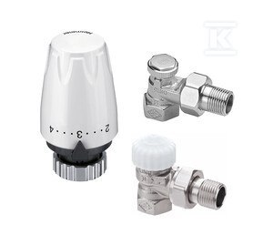 Głowica termostatyczna DX M30x1.5 z dolnym ogranicznikiem, wartości nastaw 2-5 Zakres nastaw temp. 16 °C do 28 °C oraz zawór termostatyczny V-exakt II DN15 niklowany, kapa biała, kątowy, z nastawą wstępną oraz grzejnikowy zawór odcinający, Regutec DN15(1/2), kątowy, niklowany o numerze katalogowym DMK862 w kategorii Głowice termostatyczne i zawory>Głowice termostatyczne tradycyjne. Produkt wyprodukowany przez markę IMI HEIMEIER, seria DX.