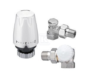 Głowica termostatyczna DX M30x1.5 z dolnym ogranicznikiem, wartości nastaw 2-5 Zakres nastaw temp. 16 °C do 28 °C oraz zawór termostatyczny V-exakt II DN15 niklowany, kapa biała kątowo-narożny do montażu z prawej strony grzejnika, z nastawą wstępną oraz grzejnikowy zawór odcinający Regutec DN15(1/2), kątowy, niklowany o numerze katalogowym DMK857 w kategorii Głowice termostatyczne i zawory>Głowice termostatyczne tradycyjne. Produkt wyprodukowany przez markę IMI HEIMEIER, seria DX.