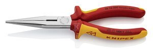 Szczypce tnące półokrągłe wydłużone (bociani dziób) z nasadkami wielokomponentowymi, izolowane wg VDE chromowany 200 mm o numerze katalogowym  26 16 200 w kategorii Wkrętaki i szczypce>Szczypce. Produkt wyprodukowany przez markę KNIPEX.