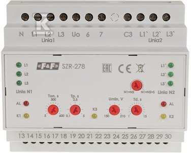 Sterownik załączania rezerwy, sieć 3 i 4-przewodowa, 24÷230V AC, o numerze katalogowym SZR-278 w kategorii Przekaźniki czasowe, Przekaźniki. Produkt wyprodukowany przez markę F&F.